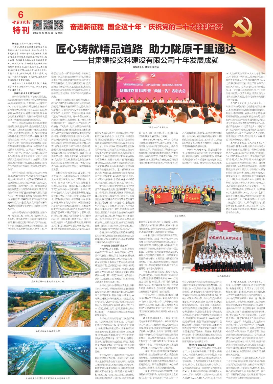 【编者按】:荏苒十年,弹指一挥间。十年前,甘肃省交科建设有限公司乘势而生,在行业跌宕起伏、风云变幻的十个春夏秋冬中,历经十年的洗礼与沉淀,交科公司在高质量发展的道路上蹄疾步稳、乘风破浪,各项经营指标和发展质效稳步提升。纵观这十年,作为k1体育注册就送38元市政公路领域的重要企业,我们艰苦创业,开拓创新,我们诚实守信,合规经营,在兰州新区,在花儿之乡,在河西走廊,在黄土高坡,建设了一大批市政道路、县域公路,为陇原千里通达做出了重要贡献。