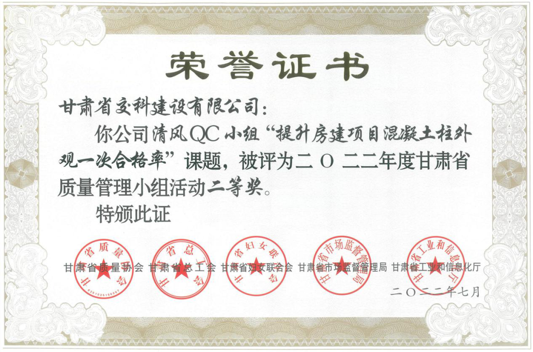 截至目前,交科公司连续三年荣获“甘肃省质量管理小组活动优秀企业”荣誉称号,共拥有省级QC成果特等奖2项、一等奖18项、二等奖3项。