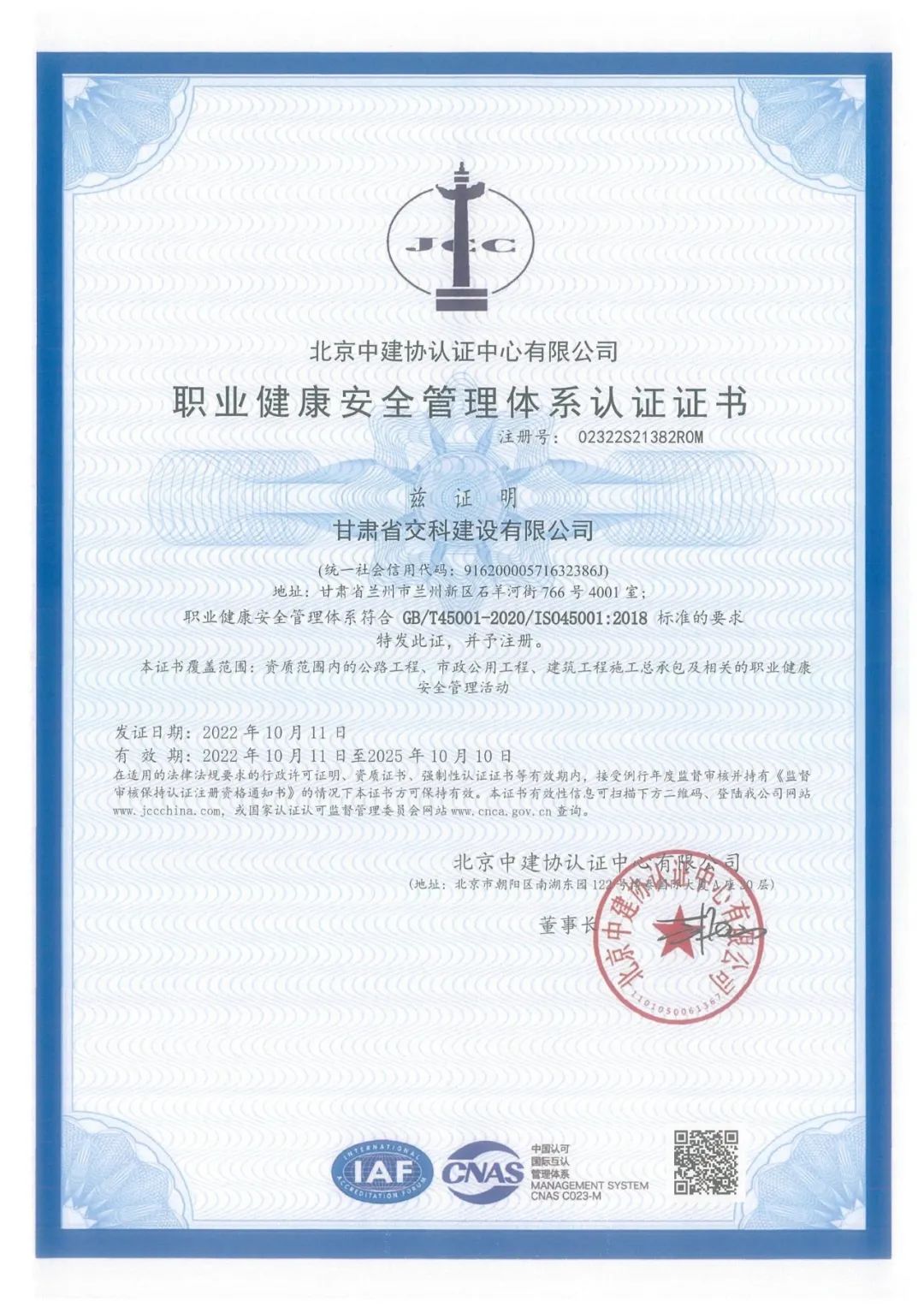近日,甘肃省交科建设有限公司顺利通过北京中建协认证中心“三体系”一、二阶段审核,并顺利取得审核中心颁发的质量、环境、职业健康安全管理体系认证证书。