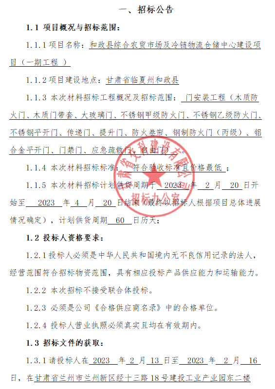 和政县综合农贸市场及冷链物流仓储中心建设项目(一期工程 )材料招标