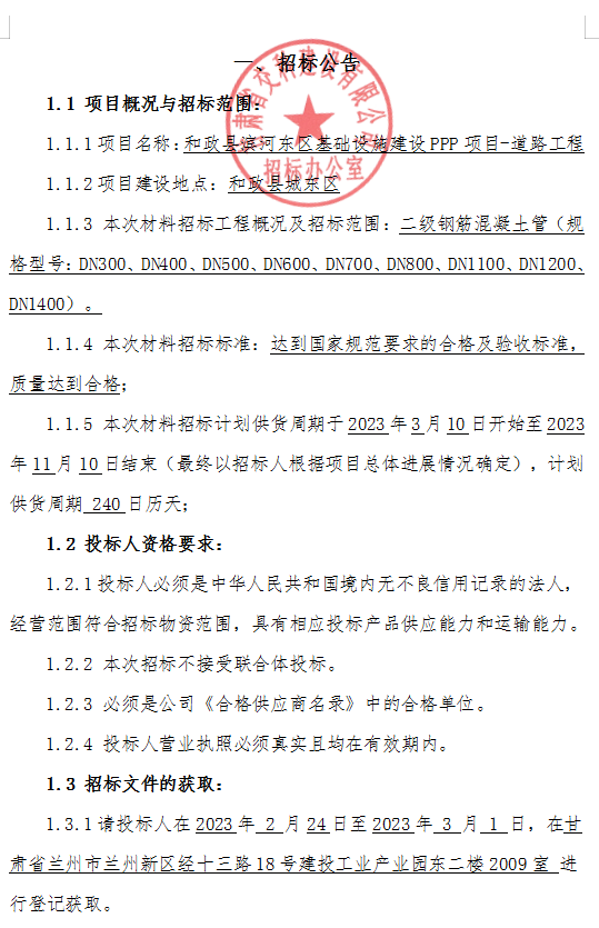 和政县滨河东区基础设施建设PPP项目-道路工程材料招标公告