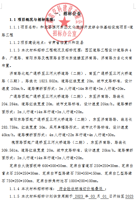 <h3>和政县滨河东区文化旅游开发综合体基础设施项目-道路工程材料招标公告</h3>