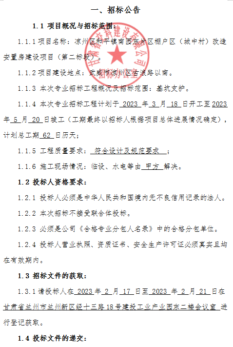 凉州区和平镇南园东片区棚户区(城中村)改造安置房建设项目(第二标段)专业分包招标