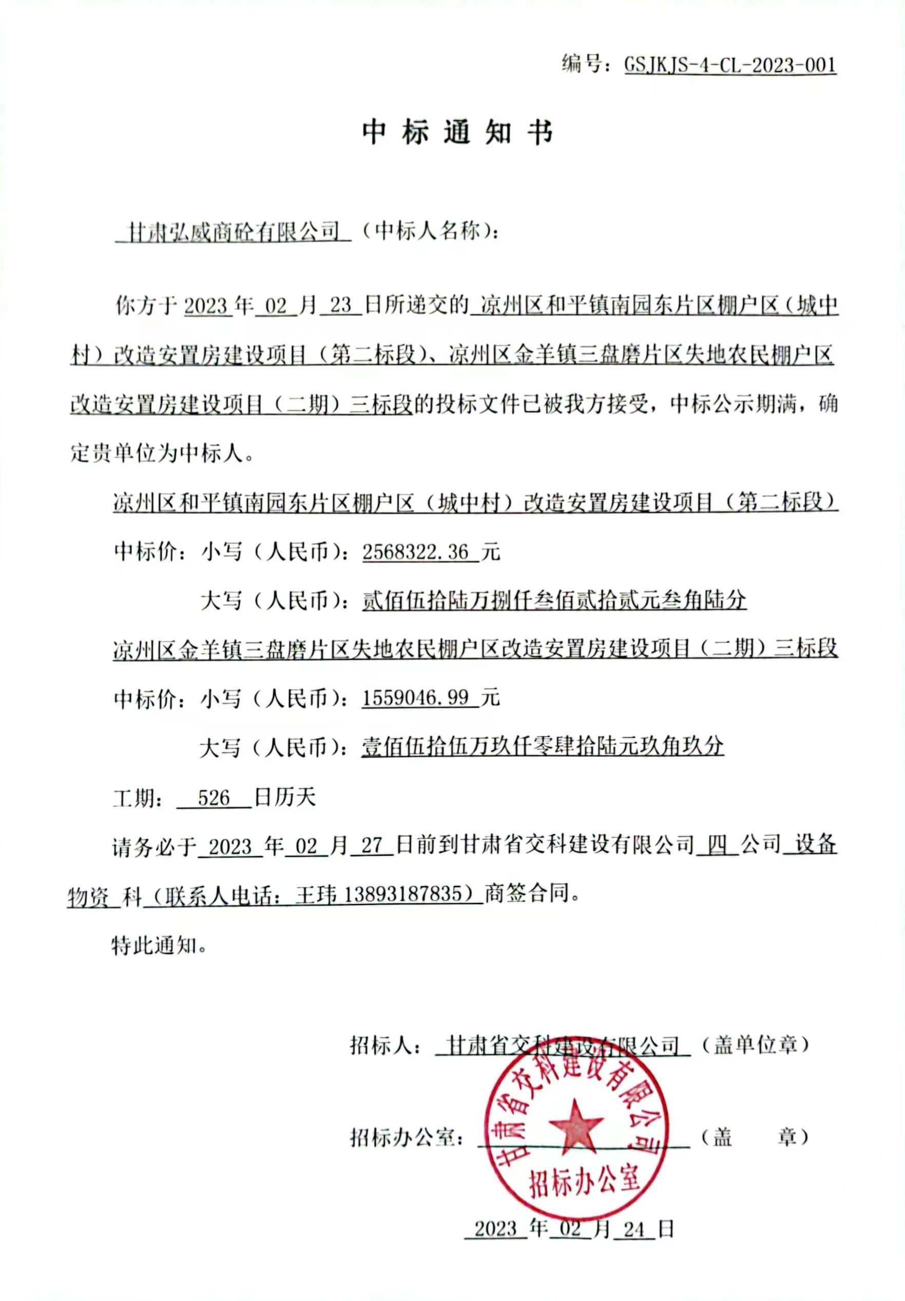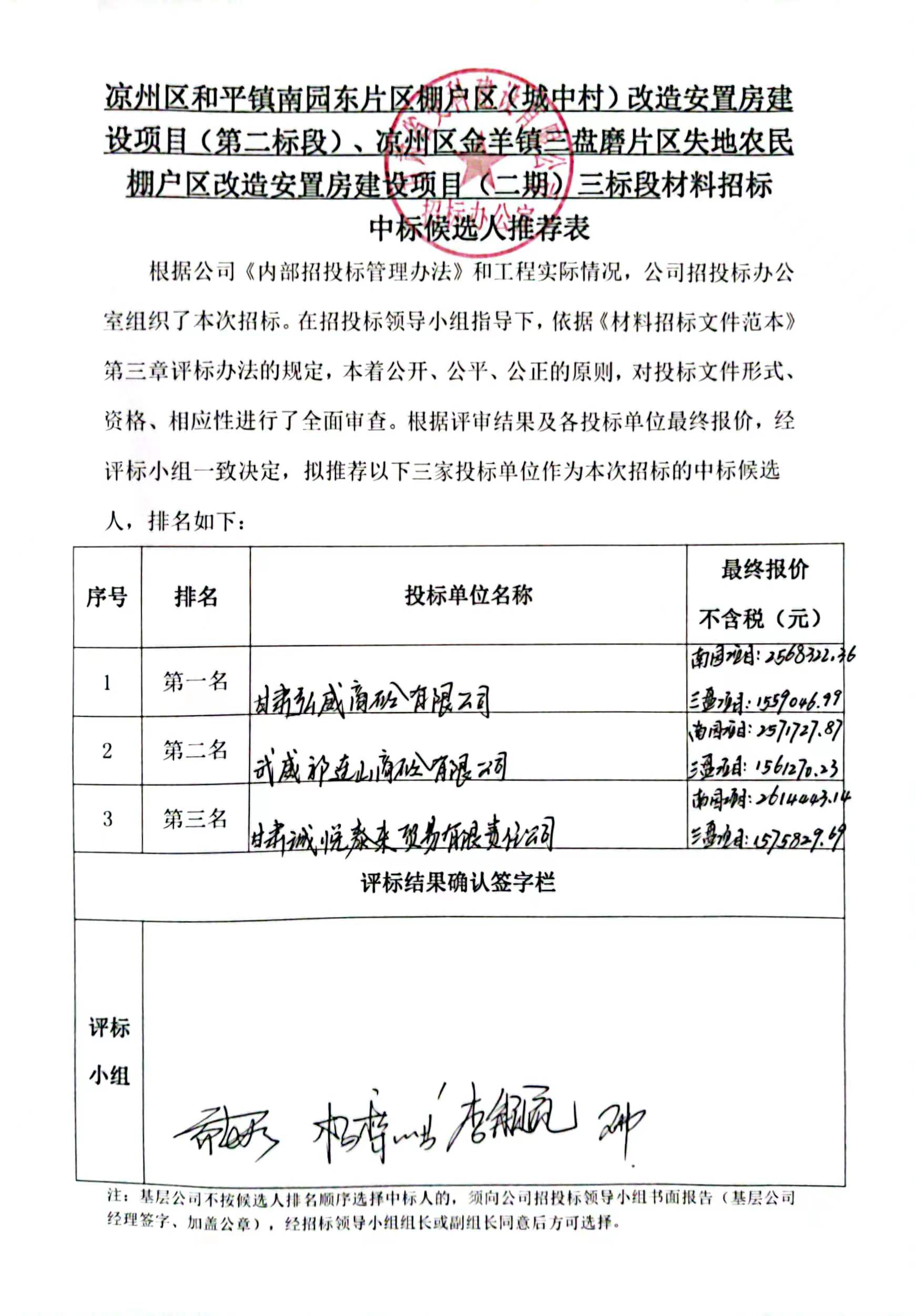 凉州区和平镇南园东片区棚户区(城中村)改造安置房建设项目(第二标段) 凉州区金羊镇三盘磨片区失地农民棚户区改造安置房建设项目(二期)三标段中标候选人及中标通知书