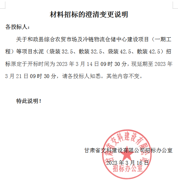 <h3>关于和政县综合农贸市场及冷链物流仓储中心建设项目（一期工程）等项目水泥招标的澄清变更说明</h3>