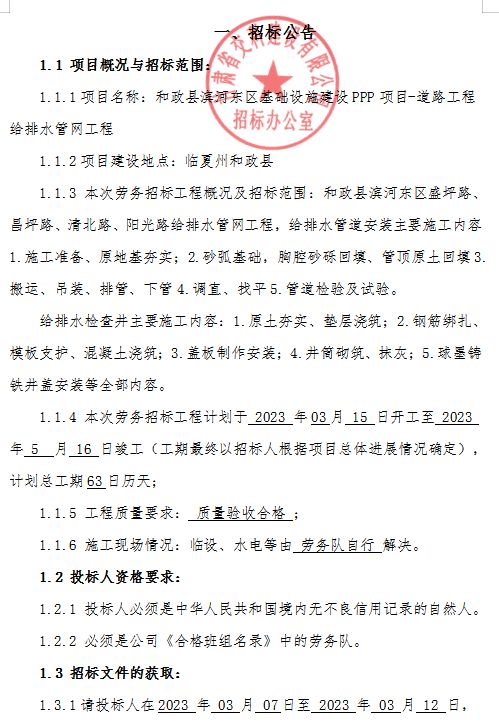 <h3>和政县滨河东区基础设施建设PPP项目-道路工程给排水管网工程-招标公告</h3>