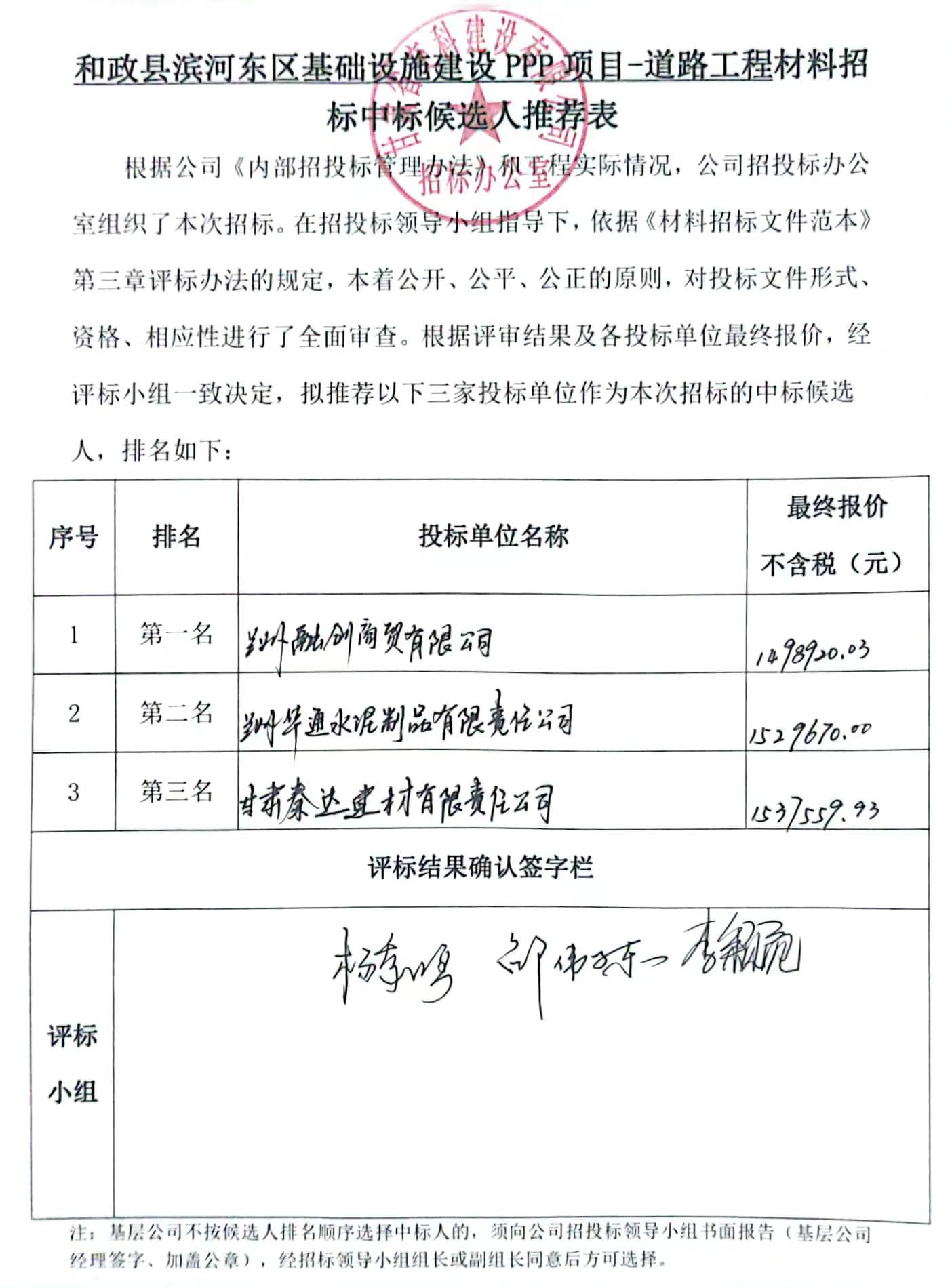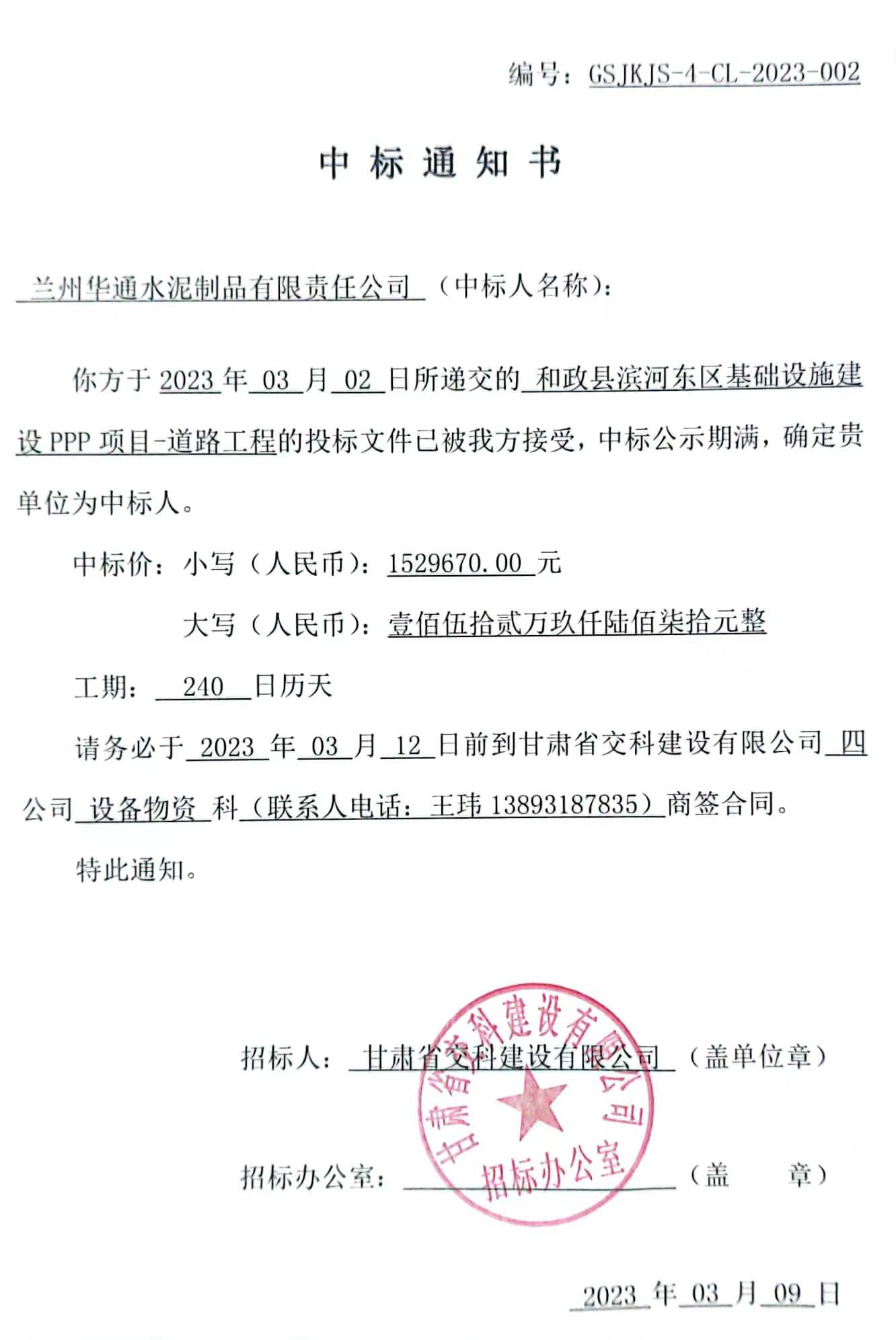 和政县滨河东区基础设施建设PPP项目-道路工程中标候选人及中标通知书