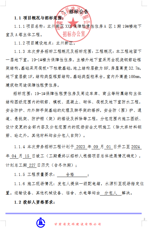 <h3>兰州新区XXX保障租赁性住房A 区1期19#楼地下室及A塔主体工程劳务招标公告</h3>