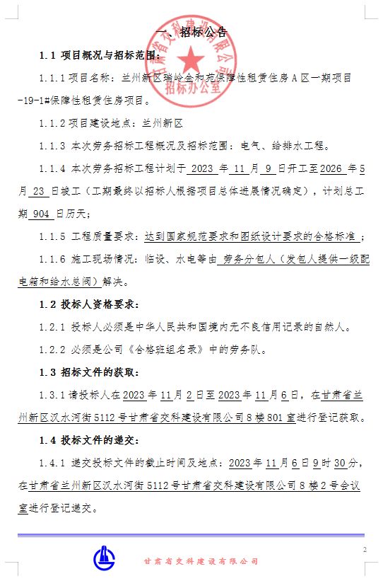 兰州新区瑞岭金和苑保障性租赁住房A区一期项目-19-1#保障性租赁住房-招标公告