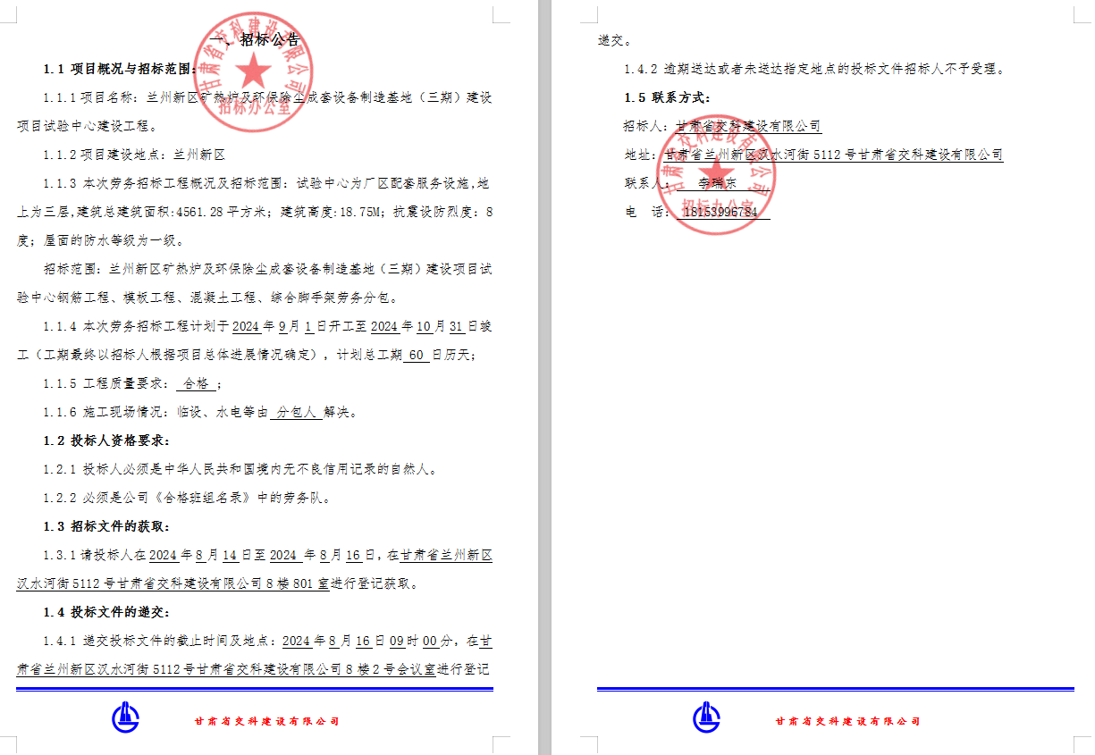 <h3>兰州新区矿热炉及环保除尘成套设备制造基地（三期）建设项目试验中心建设工程-钢筋、模板、混凝土、综合脚手架-招标公告</h3>