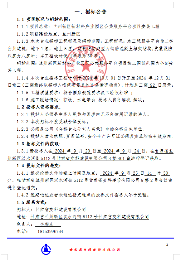 兰州新区新材料产业园区公共服务平台项目安装工程-招标公告