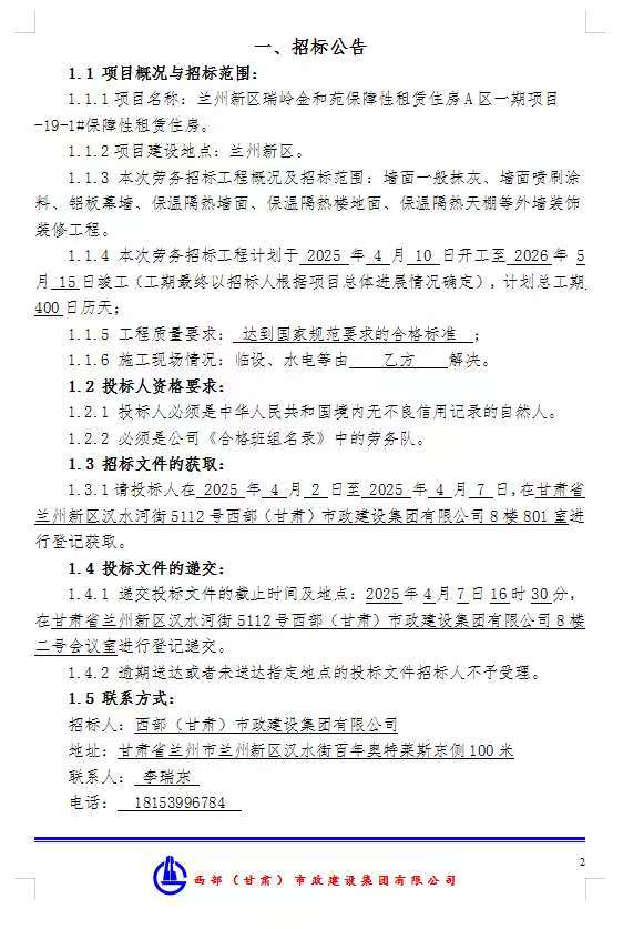 兰州新区瑞岭金和苑保障性租赁住房A区一期项目-19#-1#保障租赁住房-墙面一般抹灰等劳务分包招标公告
