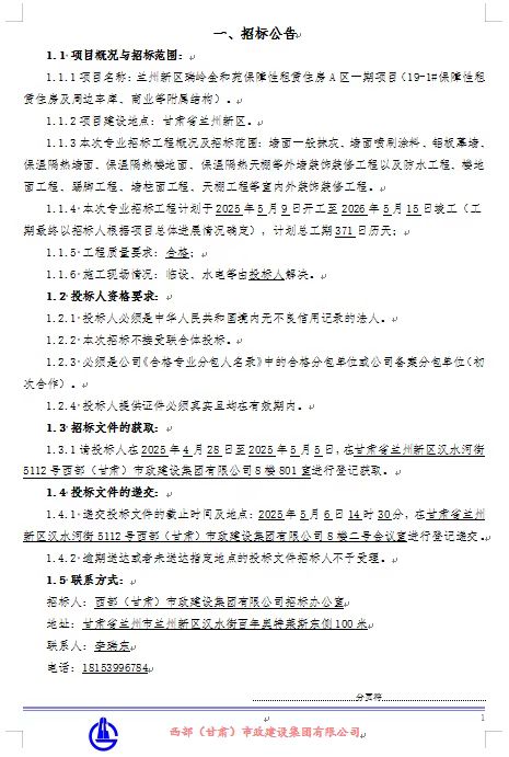 兰州新区瑞玲金和苑保障性租赁住房A区一期项目(19-1#保障性租赁住房及周边车库、商业等附属结构)专业分包招标公告