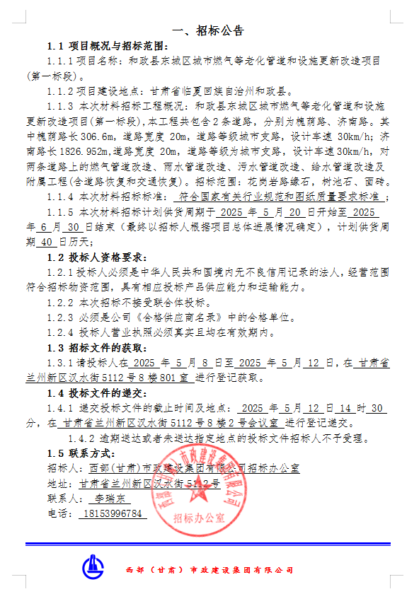 <h3>和政县东城区城市燃气等老化管道和设施更新改造项目（第一标段）花岗岩路缘石、树池石、面砖招标公告</h3>