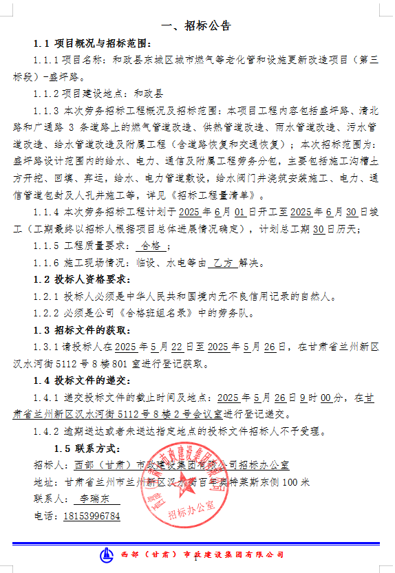 和政县东城区城市燃气等老化管和设施更新改造项目(第三标段)-盛坪路-劳务招标公告