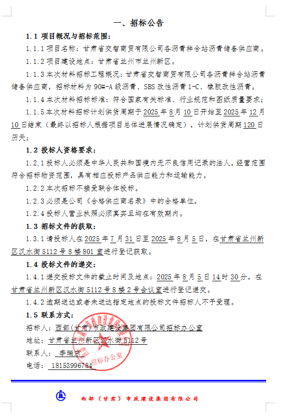 <h3>甘肃省交智商贸有限公司各沥青拌合站沥青储备供应商-材料招标公告</h3>