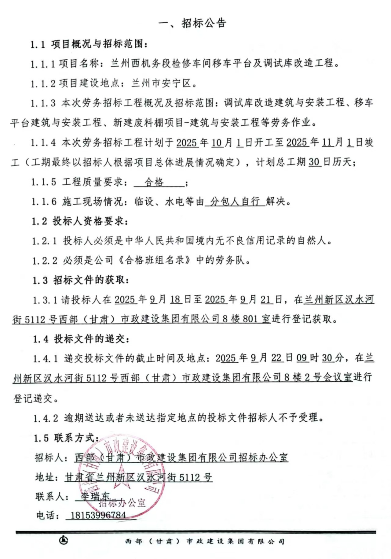 兰州西机务段检修车间移车平台及调试库改造工程-劳务分包招标公告